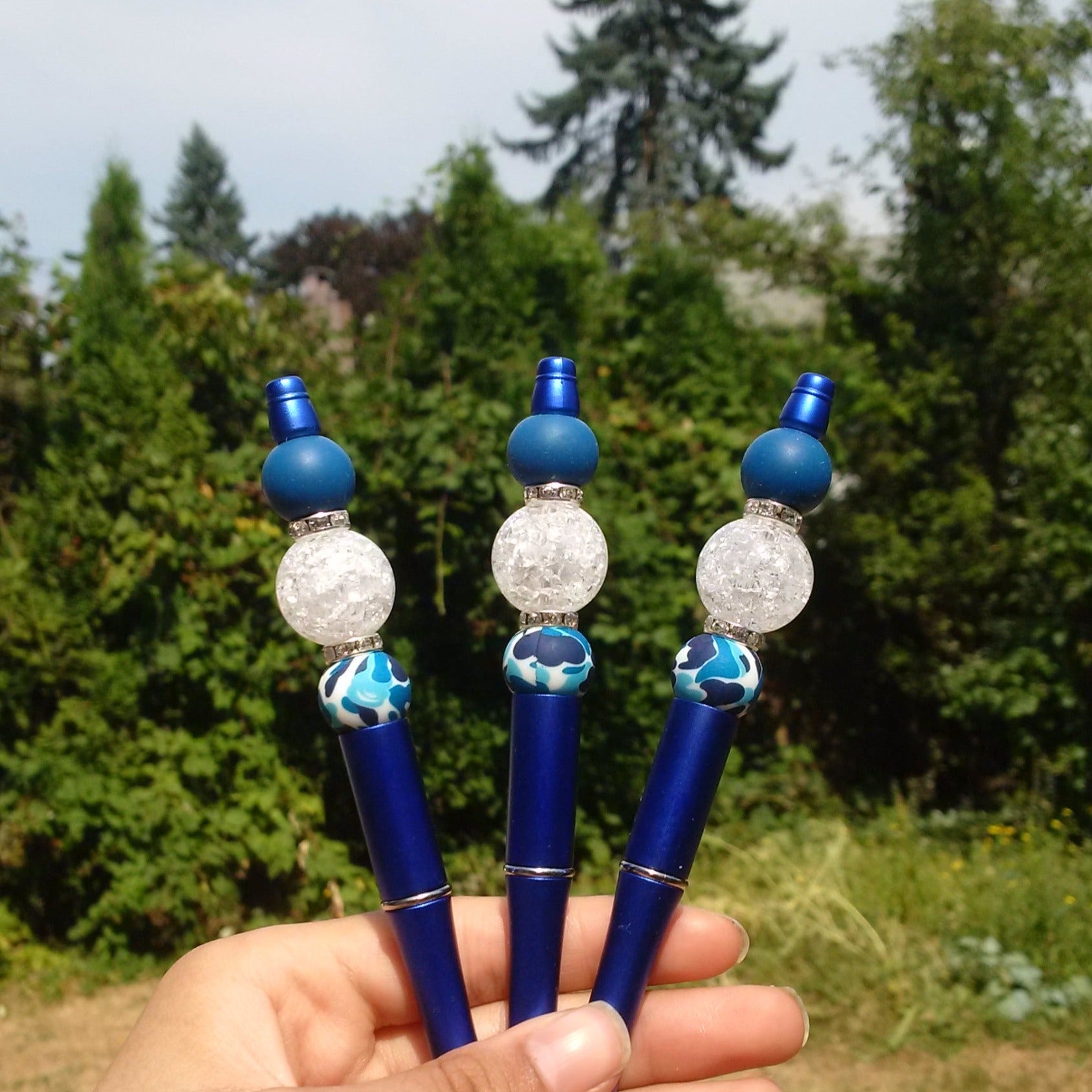 An elegant addition to any writing desk, this handmade Crystal Blue Beaded Pen boasts a classic and luxurious design that is sure to elevate any writing experience. The elegant crystal blue beads, carefully strung together by hand, provide an aesthetically pleasing, sophisticated touch to your writing. Enjoy the timeless style and tasteful refinement of this sophisticated pen.